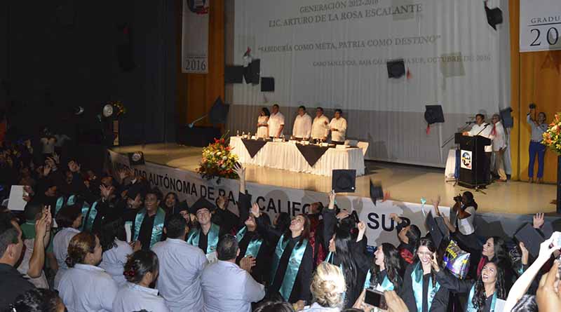 Cabo San Lucas.- Un total de 62 alumnos de 4 licenciaturas generación 2012-2016, concluyeron sus estudios en la Universidad Autónoma de Baja California Sur, campus Los Cabos. De acuerdo a cifras, de manera general, el 70% de los profesionistas que egresan de la máxima casa de estudios, logra integrarse a un trabajo afín a la carrera que estudió.