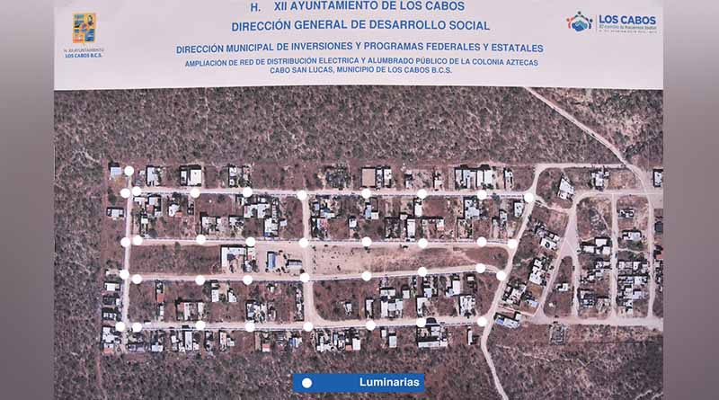 Del mismo modo informó que aparte de las colonias antes mencionadas, se va a proveer de alumbrado público a colonias de Cabo San Lucas, entre ellas: Leonardo Gastelum, Tierra y Libertad, Palmas, Mesa Colorada, Cabo Fierro, Miramar y Venados, entre otras, para que las familias puedan disfrutar de un servicio básico que favorezca en sus actividades cotidianas.
