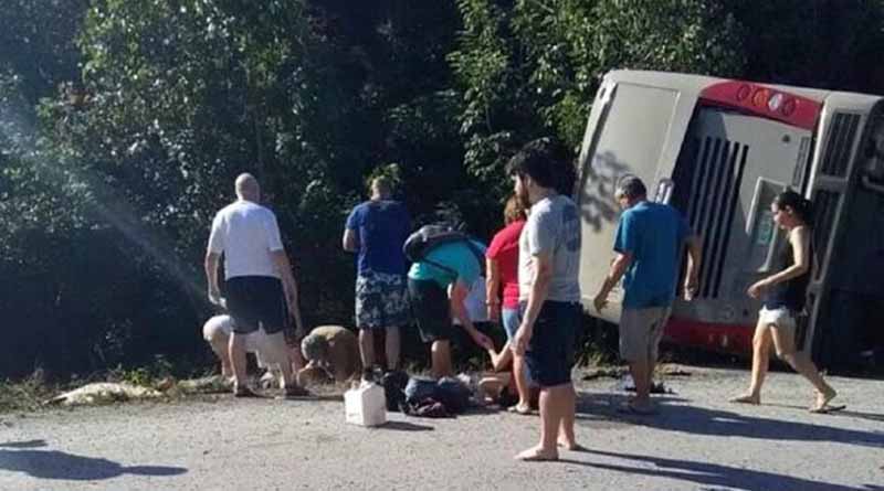 Los 31 pasajeros, viajaban a bordo de un autobús de la empresa Turismo Costa Maya, son visitantes de Mahahual que arribaron en el crucero Royal Caribbean con destino a la zona arqueológica de Chaccobén.