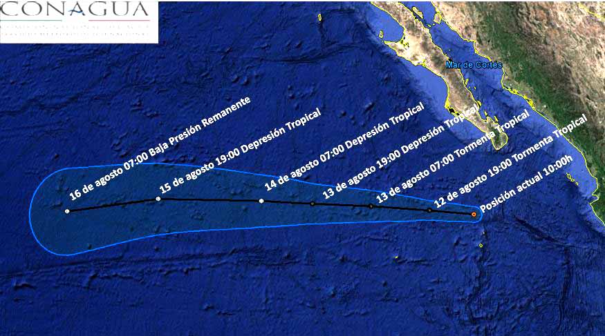 Precisó que el meteoro se localiza a 40 kilómetros al noreste de Isla Socorro, Colima, y a 385 kilómetros al sur de Cabo San Lucas, B.C.S.