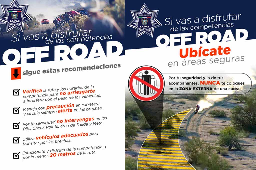 El funcionario resaltó, que durante la etapa de traslado, los vehículos de competencia circularán como un vehículo más en la vialidad, respetando el reglamento de tránsito y serán sujetos a sanciones por parte de la autoridad en caso de cometer alguna infracción. Así mismo, elementos de la corporación se desplegarán por la zona del monumento Cola de Ballena, Calzada Agustín Olachea, Libramiento Juan De Dios Angulo y por el cauce del arroyo El Cajoncito en la colonia Agua Escondida en esta ciudad de La Paz, así como en los diversos puntos carreteros y áreas pobladas en las delegaciones por donde cruce la ruta de competencia, a fin de brindar seguridad vial en esas zonas.