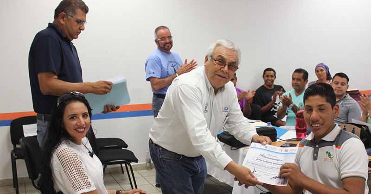 Cabo San Lucas, BCS.- El Senador Isaías González Cuevas, acompañado de representantes de la Asociación de Hoteles de Los Cabos, de la Cámara Nacional de Comercio, de la Cámara Nacional de la Industria Restaurantera y de la Industria de la Transformación, encabezó en el edificio sindical de esta ciudad la entrega de reconocimiento a los participantes a los cursos de capacitación para la realización de proyectos productivos, entre los que destacaron empresas recicladoras, granjas de huevo orgánico y fábrica de jabón con productos regionales.