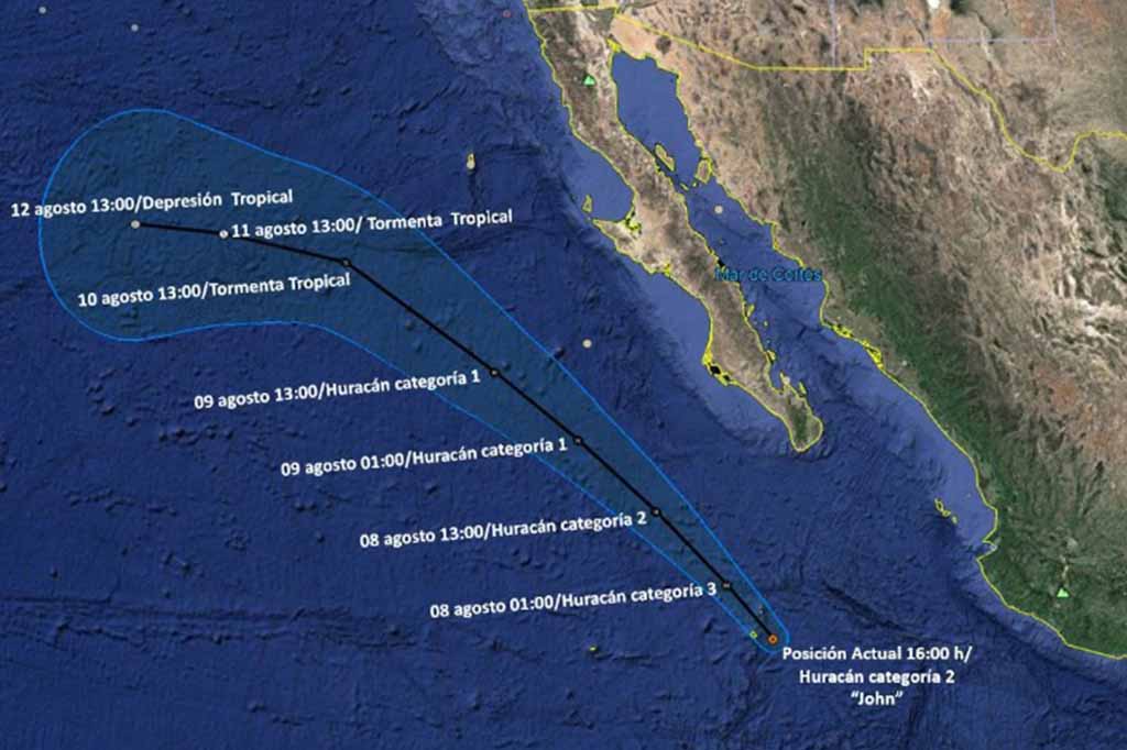 El Consejo Estatal de Protección Civil, está atento al comportamiento del huracán John categoría 2, el cual de acuerdo al último pronóstico emitido por la Comisión Nacional del Agua (CONAGUA), a través del Servicio Meteorológico Nacional, se localiza a 470 km al sur de Cabo San Lucas, y no representa un riesgo directo sobre Baja California Sur, sin embargo, se está dando puntual seguimiento a su trayectoria, informó el subsecretario del ramo, Carlos Alfredo Godínez León.