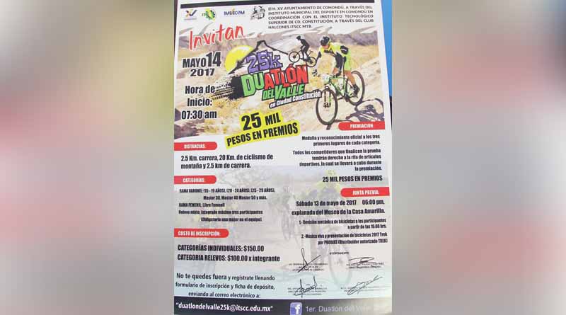 El Ayuntamiento de Comondú, en coordinación con el Instituto Tecnológico de Ciudad Constitución y el Club Halcones MTB, están invitando a deportistas a participar en el 1er. Duatlón del Valle 25k, que se llevará a cabo el próximo 14 de mayo en Ciudad Constitución.