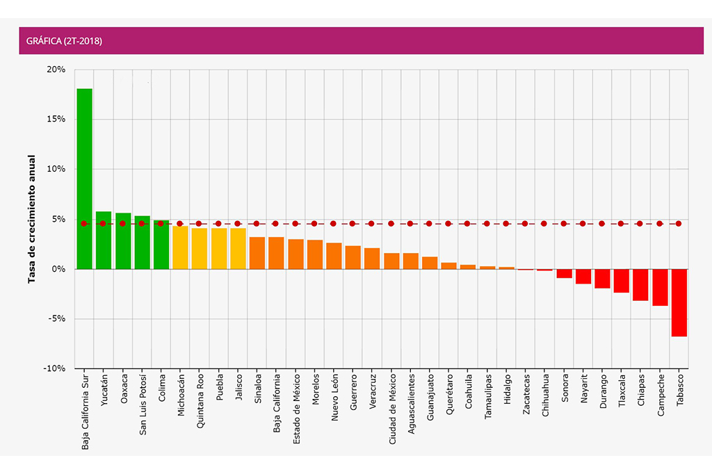 Mendoza Davis indicó que la medición que cada tres meses se realiza en todas las entidades federativas “nos ofrece un panorama de la evolución económica en los estados en el corto plazo y en este sentido Baja California Sur para el pasado segundo trimestre del 2018 se encuentra cerca de 13 puntos arriba de Yucatán y Oaxaca que mantienen el segundo y tercer lugar con poco más de 5 por ciento cada uno de estos estados”, recalcó.