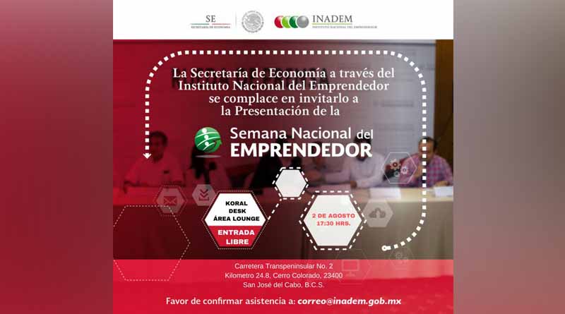 “La Secretaría de Economía a través del Instituto Nacional del Emprendedor escogió a Baja California Sur para hacer la presentación oficial de la Semana del Emprendedor, la cual se va a llevar a cabo del 11 al 15 de septiembre en la Ciudad de México y el municipio de Los Cabos estará presente durante las mesas de trabajo y conferencias programadas”, expuso el director municipal.