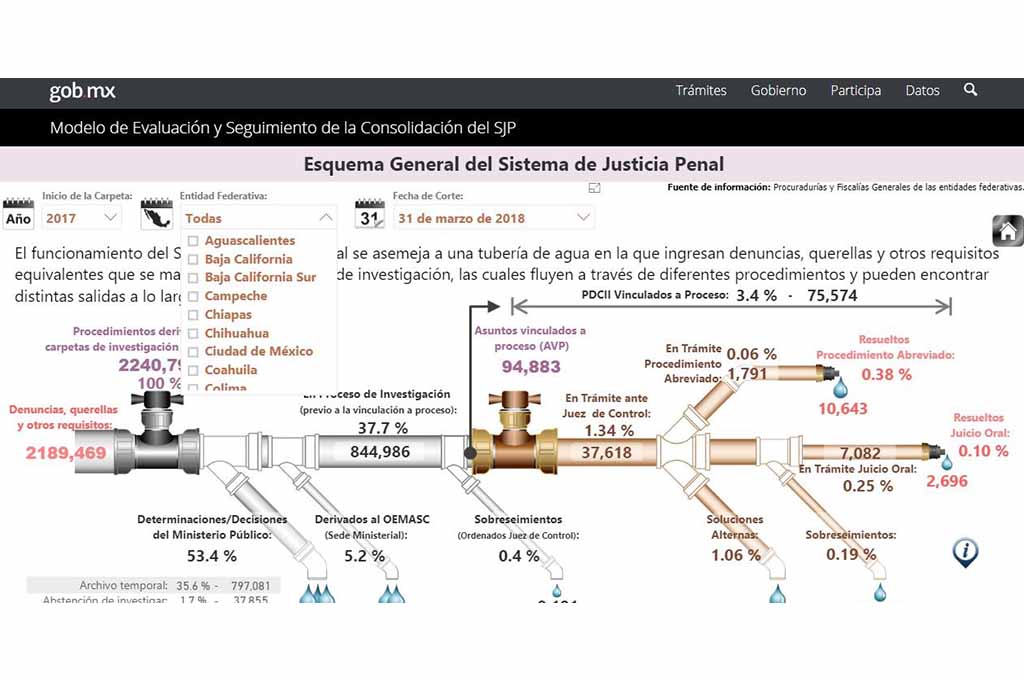 “Este sistema denominado Modelo de Evaluación y Seguimiento de la Consolidación del Sistema de Justicia Penal, básicamente es un programa informático que contiene la información proporcionada por las Procuradurías y Fiscalías generales de Justicia de las entidades del país respecto al proceso penal, misma que es pública y puede ser consultada por la población en general”, expresó.