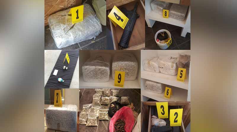 Así como 10 paquetes rectangulares conteniendo en su interior un vegetal verde y seco, al parecer marihuana, con un peso aproximado de 10 kg cada uno, un arma corta y un arma larga calibre .223.