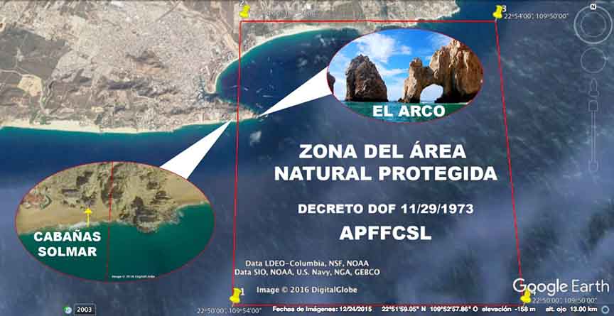 4. No se encuentra dentro de Zona Federal Marítimo Terrestre. Nos permitimos anexar dos imágenes que ilustran claramente la ubicación de las cabañas con respecto al límite del Área de Protección de Flora y Fauna Cabo San Lucas.