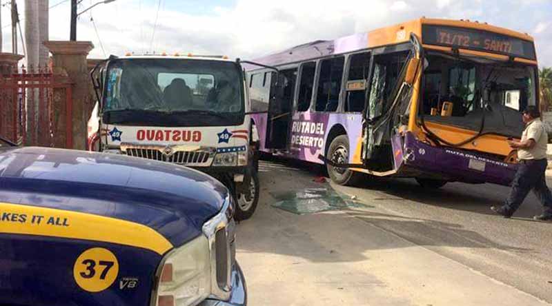 Choca camión de pasajeros contra grúa y automóvil en Santa Rosa, un lesionado