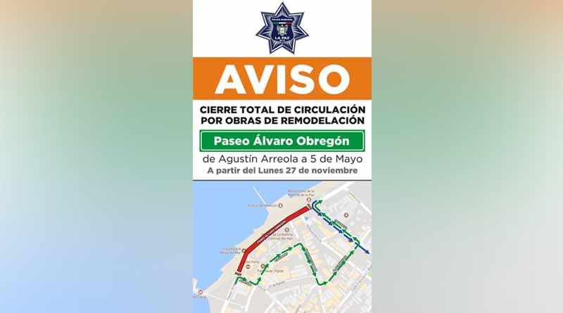 A partir de este viernes 24 de noviembre se cerrará el carril de circulación comprendido desde la calle Agustín Arreola hasta calle 5 de Mayo, concretamente en el sentido de Sur a Norte, paralelo a la zona de establecimientos comerciales, quedando abierta la circulación solamente el carril de sentido de Norte a Sur, próximo a la zona del Límite Marítimo Federal.