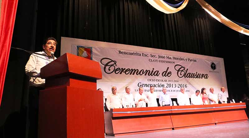 Al asisitir en representación del Gobernador del Estado, Carlos Mendoza Davis a la clausura del ciclo escolar en el marco de la graduación de la generación 2013-2016 de la Benemérita Escuela Secundaria “José María Morelos y Pavón” de la ciudad de La Paz, Jiménez Márquez aseguró que este ciclo culmina con estabilidad gracias al esfuerzo de los docentes, el acompañamiento de las madres y padres de familia, ladedicación de los alumnos y elrespaldo del gobierno estatal que marcan el inicio de una nueva etapa en este sector.