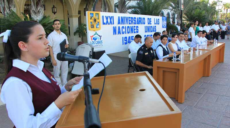 Por su parte Imelda Montaño Verduzco, Directora del Instituto de la Mujer de Los Cabos, dio el discurso oficial de la creación de la ONU, donde afirmó que recordar un aniversario más constituye una valiosa ocasión para reflexionar sobre la viabilidad del orden mundial, en el que todos en mayor o menor medida, estamos inmersos ya que todos somos ciudadanos del mundo y todos somos responsables de hacer un cambio.