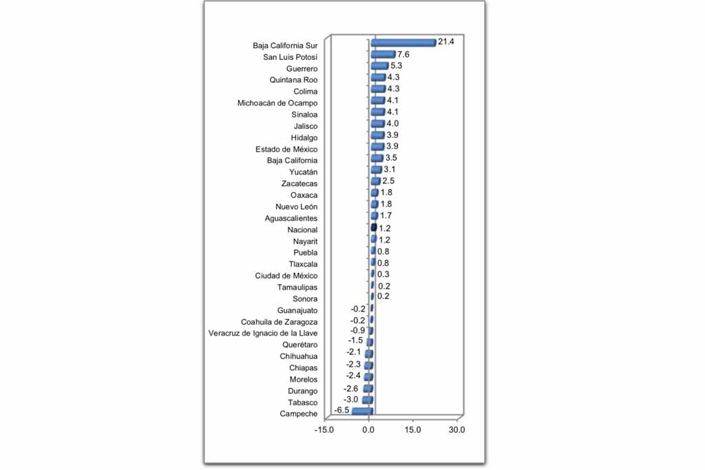 De igual manera, subrayó que el incrementó en relación con los estados que presentan aumento en su actividad económica, es del más del doble por ciento, como San Luis Potosí que creció 8.9 por ciento, Jalisco con 5.5., Hidalgo con 5.1, que son los más cercanos, expresó.