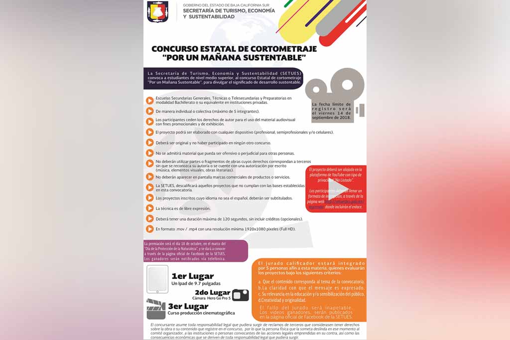 Con el objetivo de dar a conocer el significado de desarrollo sustentable, y con ello promover el uso de buenas prácticas que contribuyan al cuidado y preservación del medio ambiente, la Secretaría de Turismo, Economía y Sustentabilidad (SETUES) convoca a estudiantes de nivel medio superior al concurso estatal de cortometraje, “Por un Mañana Sustentable”, informó el subsecretario del ramo de la SETUES, Andrés de los Ríos Luna.