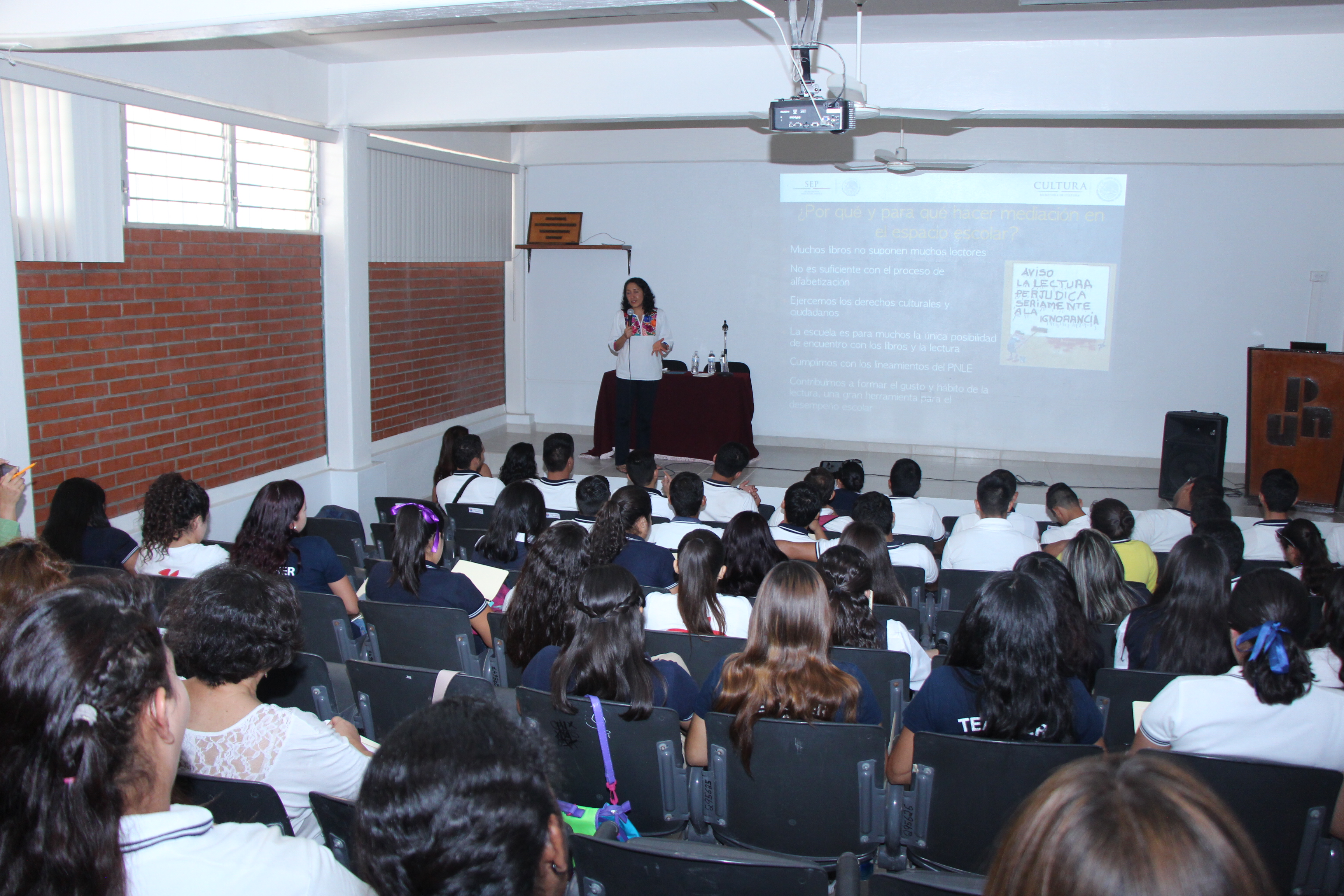 “La alegría de la mediación lectora” fue el tema de la sesión que estuvo a cargo de la docente del Programa Nacional de Salas de Lectura, Ericka Burgos, quién trabajó con alumnos de las escuelas Normal Urbana, Normal Superior, Centro Regional de Educación Normal de Loreto y la Escuela Superior de Cultura Física.