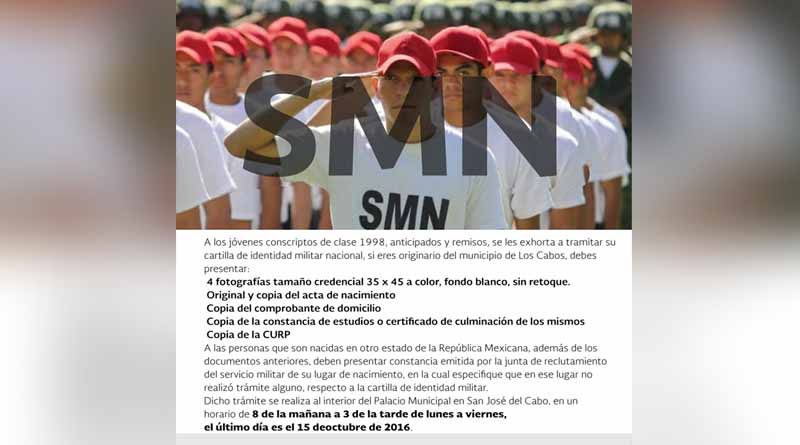 Los Cabos, B.C.S.- El gobierno de Los Cabos hace un llamado a los jóvenes conscriptos de clase 1998, anticipados y remisos, para que acudan a tramitar su cartilla de identidad militar nacional al interior del Palacio Municipal de lunes a viernes con un horario de 8 de la mañana a 3 de la tarde, hasta el día 15 de octubre del presente año toda vez que, en esa fecha concluye el alistamiento de los conscriptos por lo que es necesario acudir con la documentación que a continuación se detalla.