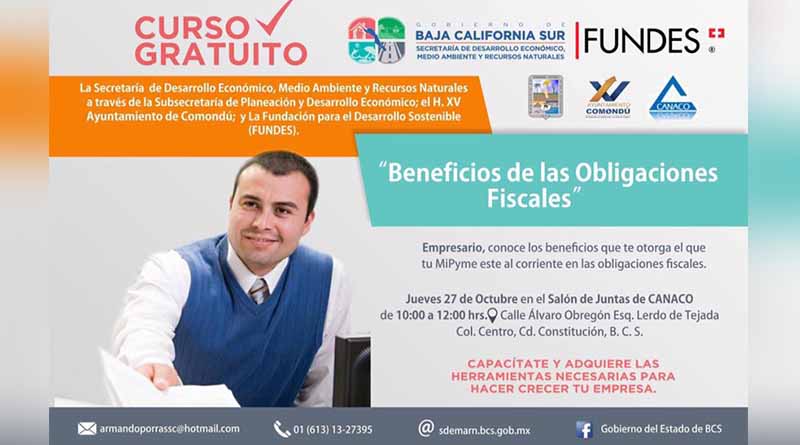 El Ayuntamiento de Comondú en coordinación con la Secretaría de Desarrollo Económico, Medio Ambiente y Recursos Naturales (SDEMARN) del Gobierno del Estado y la Fundación para el Desarrollo Sostenible (FUNDES), llevaran a cabo dos cursos gratuitos “Innovación” y “Beneficios de las Obligaciones Fiscales” en apoyo a los comerciantes del municipio, dio a conocer el Secretario de Desarrollo Municipal, José Luis Pérpuly Meza.