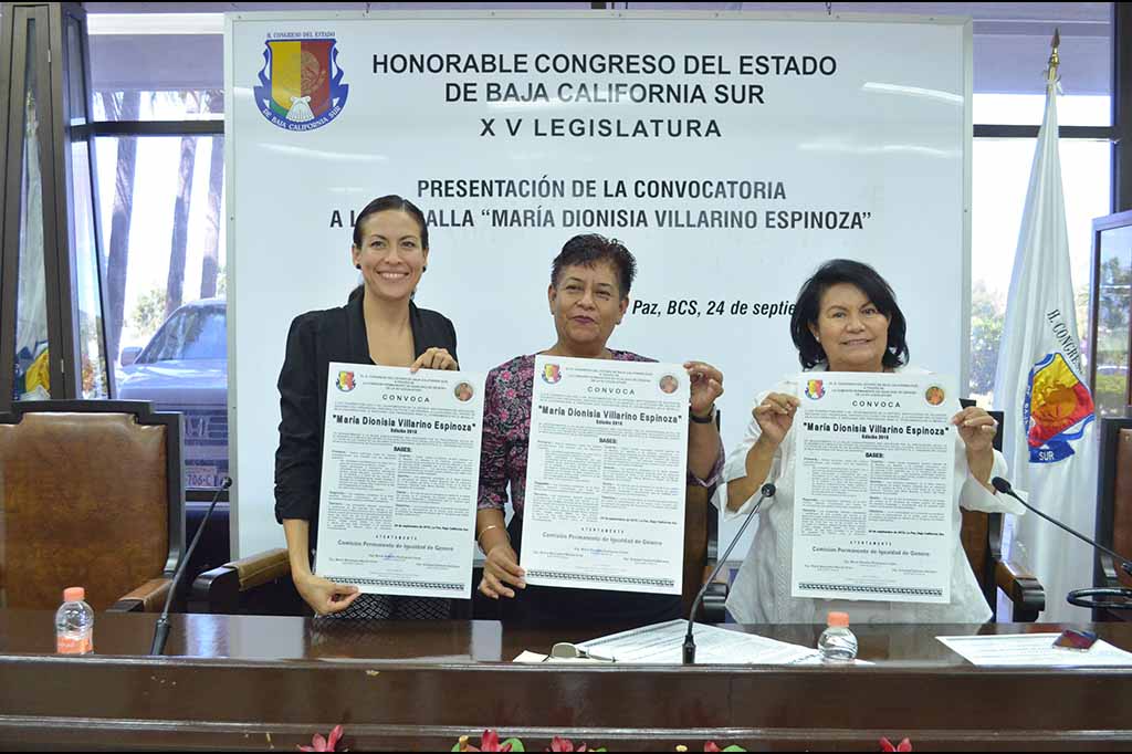 La Paz, Baja California Sur, a 24 de Septiembre de 2018.- La Comisión de Igualdad de Género del Congreso del Estado lanzó este lunes la convocatoria dirigida a la sociedad sudcaliforniana para que presenten ante la XV Legislatura propuestas de mujeres para participar en la edición 2018 de la entrega de la Medalla “María Dionisia Villarino Espinoza” que anualmente se entrega a la mujer que se haya distinguido en los campos de la política, empresarial, académico, cultural, social, científico y educativo en Baja California Sur.
