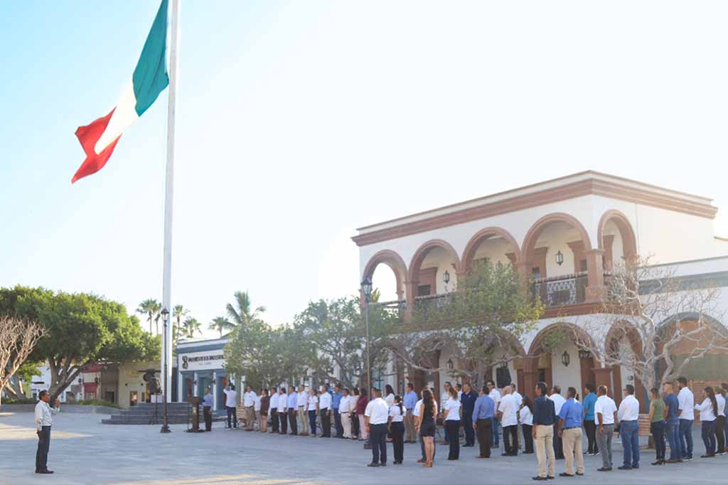 El H. XII Ayuntamiento de Los Cabos a través de la Dirección Municipal de Educación y la Dirección de Asuntos Jurídicos, Legislativos y Reglamentarios rindieron honores a la bandera, como cada lunes, donde decenas de servidores públicos iniciaron sus labores para atender a los contribuyentes del municipio.
