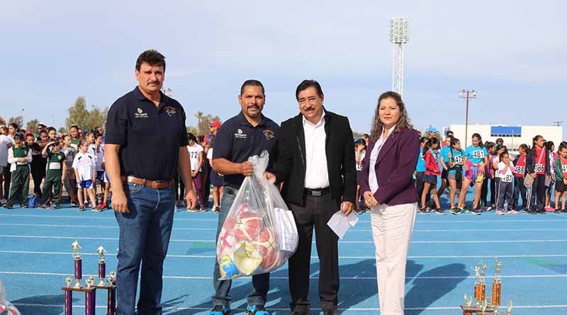 En la ceremonia que se celebró en la pistadel Instituto Tecnológico de La Paz, Jiménez Márquez entregó material deportivo y trofeos para las diversas competencias en las que participan más de 12 mil alumnos de los cinco municipios de la entidad, acción que tuvo una inversión de 539 mil pesos y que representa un incremento significativo en su presupuesto con relación al año anterior en donde fueron canalizados 338 mil pesos para esta actividad extraescolar.