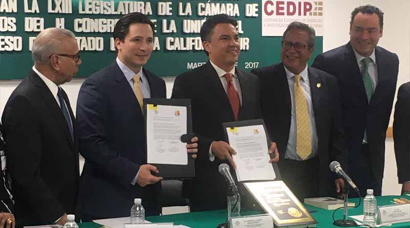 Ciudad de México, Marzo 7 de 2017.- Al firmar con la representación del Congreso del Estado el convenio de colaboración con el Centro de Estudios de Derecho e Investigación Parlamentaria de la Cámara de Diputados del Congreso de la Unión (Cedir) los presidentes de la Junta de Gobierno y Coordinación Política, Diputado Joel Vargas Aguiar y de la Diputación Permanente, Diputado Sergio García Covarrubias coincidieron en afirmar que este tipo de acuerdos “tienen como única finalidad concretar acciones tendientes a elevar la calidad del trabajo legislativo en nuestro estado y con ello mejorar los procesos legislativos para darle mejores resultados a la sociedad sudcaliforniana”.