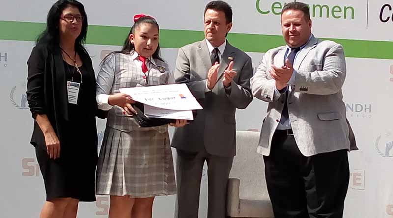 Por su capacidad y entrega los estudiantes sudcalifornianos han logrado triunfos tanto en el ámbito nacional como internacional y son un ejemplo de vida para toda la población, expresó el secretario de Educación Pública, Héctor Jiménez Márquez, quien reconoció a la alumna Aurora AlexandraBenseman Pérez de la secundaria “Pilar Cota Carrillo”, por haber obtenido el primer lugar en el certamen nacional de propuestas sobre Derechos Humanos.
