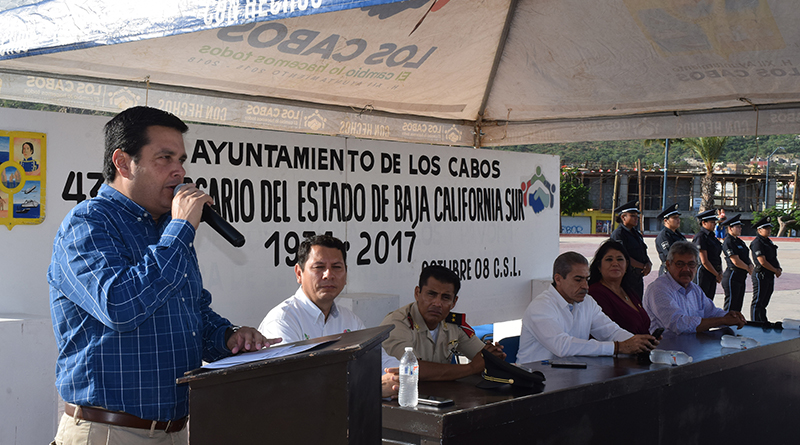 De manera simultánea a este evento que se realizó en la cabecera municipal de San José del Cabo; se realizó lo propio en la Delegación Municipal de Cabo San Lucas, en donde presidió la ceremonia el Delegado, Francisco García Valdez, quien expresó que, esta fecha histórica vino a darle certeza jurídica al estado trayendo con esto un alto índice de crecimiento acelerado en la década de los ochentas y hoy a 43 años de distancia, el esfuerzo de aquellos hombres y mujeres está claro en Baja California Sur ya que al día de hoy es una entidad federativa con el menor índice de desempleo y con un desarrollo social de gran importancia, gobernada en los últimos años por las tres fuerzas políticas más representativas de México, dando con esto muestra de madures democrática.