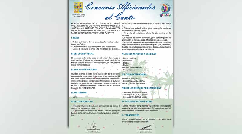 Sobre las bases: podrán participar todos los cantantes aficionados residentes en Los Cabos, donde cada concursante podrá interpretar sólo una canción y el cupo al concurso se limita a 15 intérpretes por categoría.