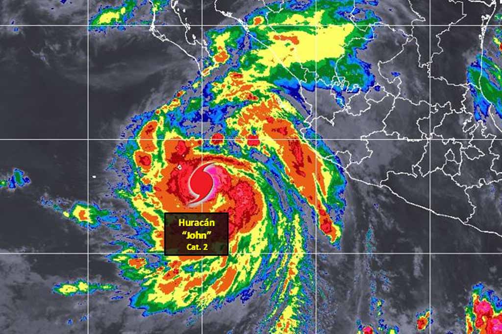Indicó que John se localizó a 510 kilómetros (km) al oeste-suroeste de Cabo Corrientes, Jalisco, y a 555 km al sur de Cabo San Lucas, Baja California Sur, y genera tormentas muy fuertes en regiones de Baja California Sur, Sinaloa, Nayarit, Jalisco, Colima y Michoacán.