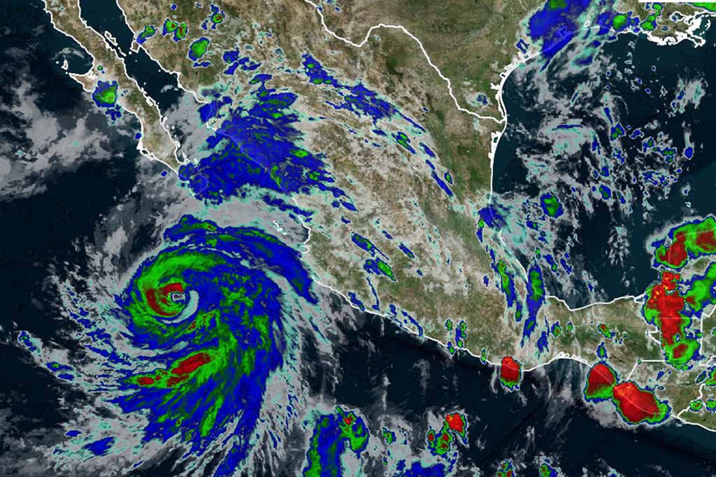 El meteoro avanza con vientos máximos sostenidos de 155 kilómetros por hora (km/h), rachas de 195 km/h y desplazamiento hacia el nor-noroeste a 20 km/h, informó el Servicio Meteorológico Nacional (SMN), dependiente de la Comisión Nacional del Agua (Conagua).