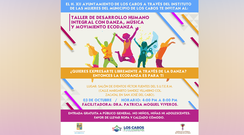 Para empoderar a las mujeres del municipio de Los Cabos con actividades productivas y recreativas, el Instituto de la Mujeres que encabeza Imelda Montaño Verduzco invita a los Talleres de Gelatina Artística y de Desarrollo Humano Integral con Danza, Música y Movimiento Ecodanza que serán el 30 de septiembre y el 3 de octubre respectivamente, ambas en San José del Cabo.