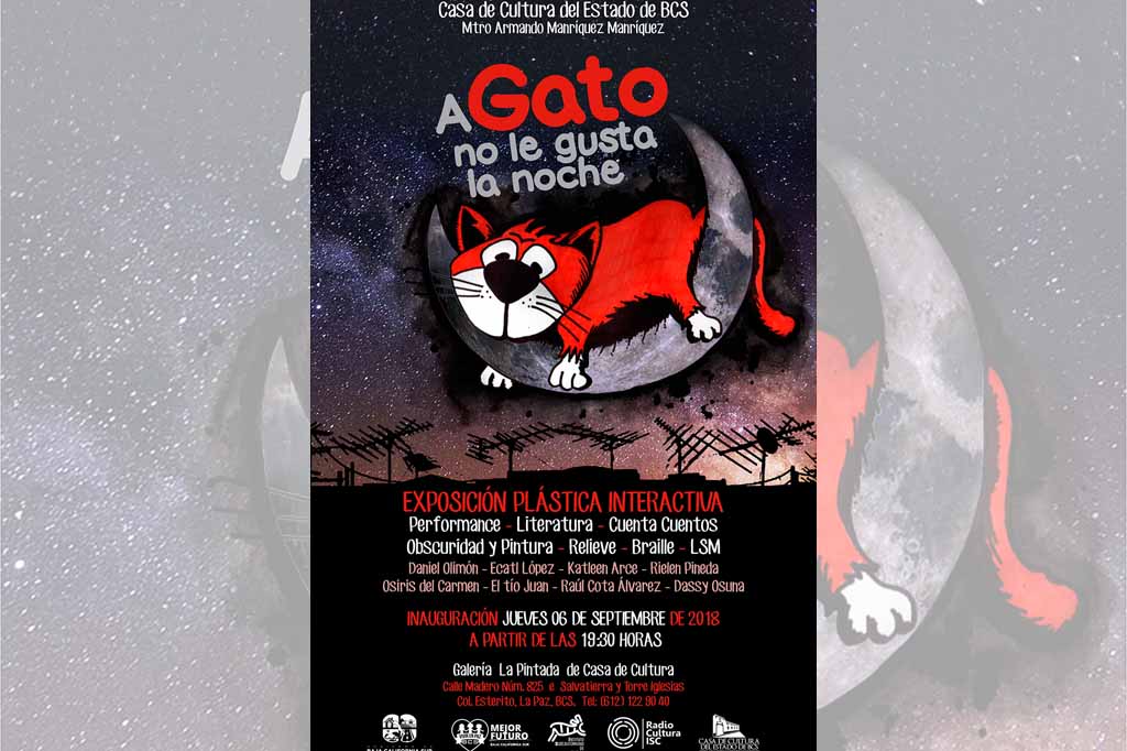Con la finalidad de promover el gusto por el arte visual en la entidad, el Instituto Sudcaliforniano de Cultura (ISC), a través de la Casa de Cultura del Estado, llevará a cabo el próximo jueves 6 de septiembre, la exposición interactiva “A Gato no le Gusta la Noche”, informó el director, Christopher Amador Cervantes.