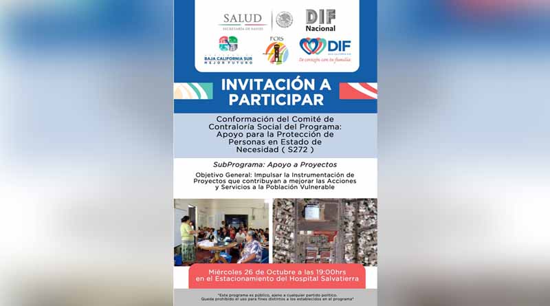 En el Sistema Estatal DIF, se trabaja por el desarrollo de las familias que habitan en Baja California Sur, es por eso que el próximo miércoles 26 de octubre se llevará a cabo la conformación del comité de contraloría social para del programa: apoyo para la protección de personas en estado de necesidad dijo la directora general del SDIF en BCS, Dora Luz Salazar Sánchez al informar sobre la instalación del comité que tendrá el nuevo albergue de Asistencia Social del SDIF.
