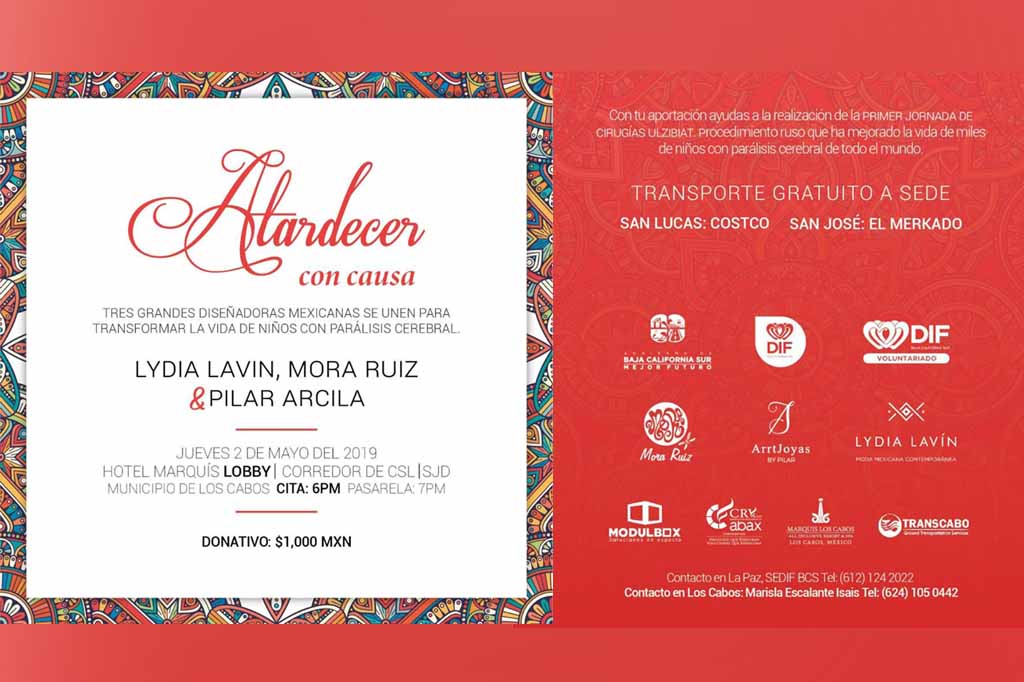 Gabriela Velázquez puntualizó que en esta segunda edición contara con unapasarela de las tres diseñadoras mexicanas Lydia Lavin, Mora Ruíz y Pilar Arcila, expondrán sus innovadoras colecciones de ropa y accesorios, por lo que quienes deseen asistir pueden acercarse a las oficinas de SEDIF y en Los Cabos con Marisla Escalante en el teléfono 624 1050440, para solicitar mayor información y adquirir sus boletos, los cuales tienen un costo de mil pesos.
