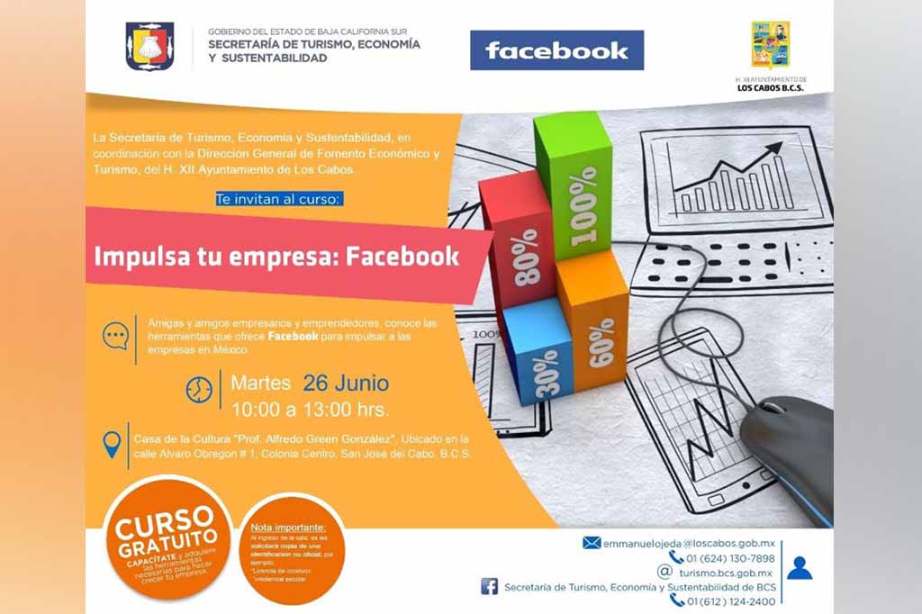Para elevar la competitividad de las micro, pequeñas y medianas empresas a partir del uso de las tecnologías, la Secretaría de Turismo, Economía y Sustentabilidad (SETUES), en coordinación con la Dirección General de Fomento Económico y Turismo del H. XII Ayuntamiento de Los Cabos, realizarán el curso de capacitación, Impulsa tu empresa: Facebook.