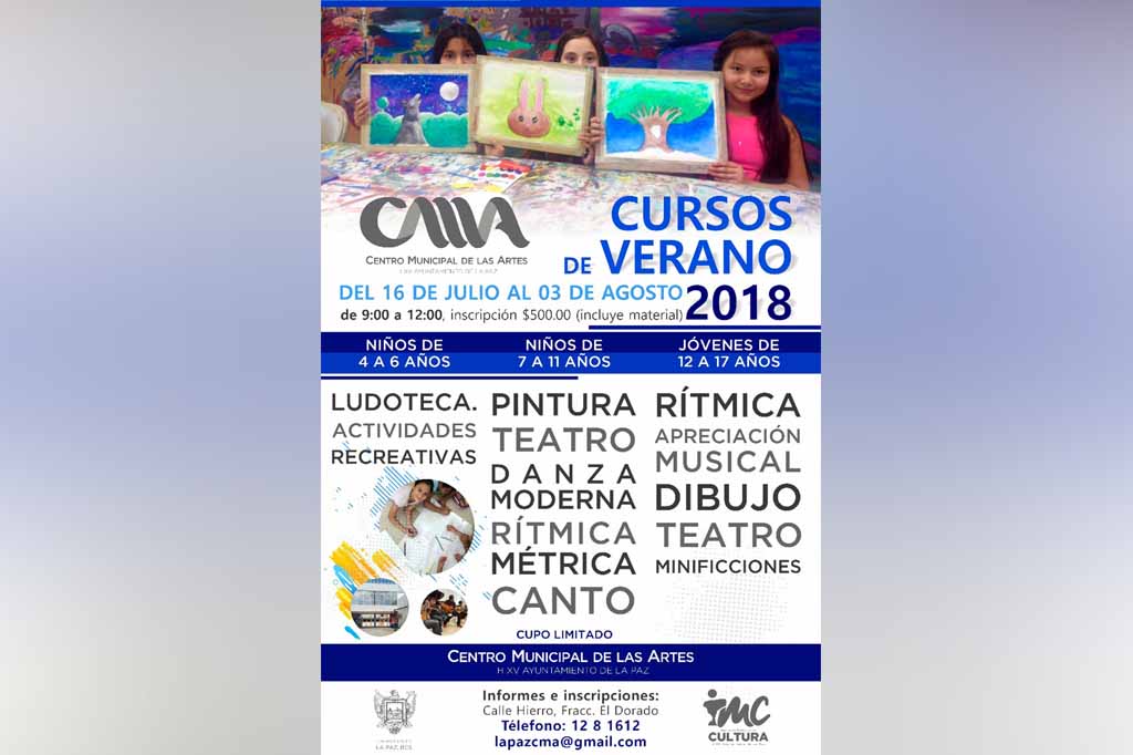Será de 16 de julio al 3 de agosto cuando se lleven a cabo los cursos de verano en el Centro Municipal de las Artes, así lo dio a conocer Cecilia Rojas García, Subdirectora del recinto cultural adscrito al Instituto Municipal de Cultura del XV Ayuntamiento de La Paz.