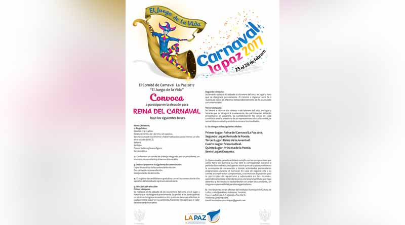 Invitan a participar en la convocatoria Reina del Carnaval La Paz 2017