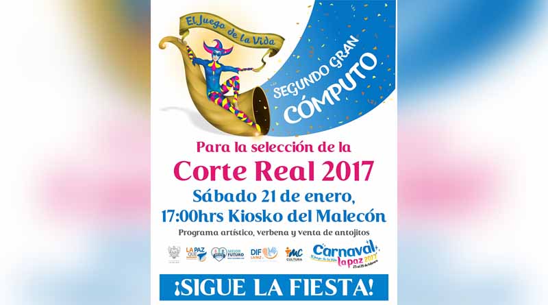 El XV Ayuntamiento de La Paz, a través del Comité de Carnaval invita este próximo sábado 21 de enero a partir de las 17:00 horas, al segundo cómputo de candidatos y candidatas a Reyes y Reinas del Carnaval La Paz 2017 “El Juego de la Vida”.