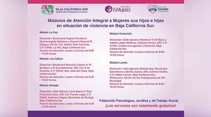 Con el objetivo de brindar atención psicológica, legal y de trabajo social a mujeres y a sus hijos e hijas que estén pasando o hayan pasado por algún tipo de violencia, la Instituto Sudcaliforniano de las Mujeres (ISMujeres), tiene a disposición los módulos de atención integral en los cinco municipios del Estado, informó la titular de ese instituto María Cristina Herrera Infante.