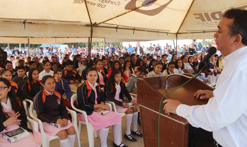 Durante el acto celebrado en Plaza Ignacio Zaragoza con la presencia de la Síndico Laura Chacón; el Secretario de Desarrollo Ing. José Luis Perpuly Meza, el profesor Eligio Cota López, representante del Sector de Primarias; el regidor Comisionado en Educación Prof. Plácido López Ramírez; el representante de la SEP Roberto Chacón Cárdenas y el regidor Roberto Yee Ledesma, el alcalde Francisco Pelayo dijo sentirse satisfecho porque en dos años se ha cambiado el rostro a las comunidades, aclarando que aún con ello, es mayor satisfacción lo que se ha venido haciendo por nuestra juventud y niñez, siendo el programa, el único a nivel nacional, promovido por un gobierno municipal.