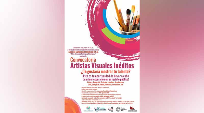 Con la finalidad de dar a conocer nuevas propuestas artísticas, el Gobierno del Estado, a través del Instituto Sudcaliforniano de Cultura (ISC) y la Casa de Cultura del Estado, invitan a todos los jóvenes creadores mayores de 18 años a participar en la convocatoria “Artistas Visuales Inéditos.”