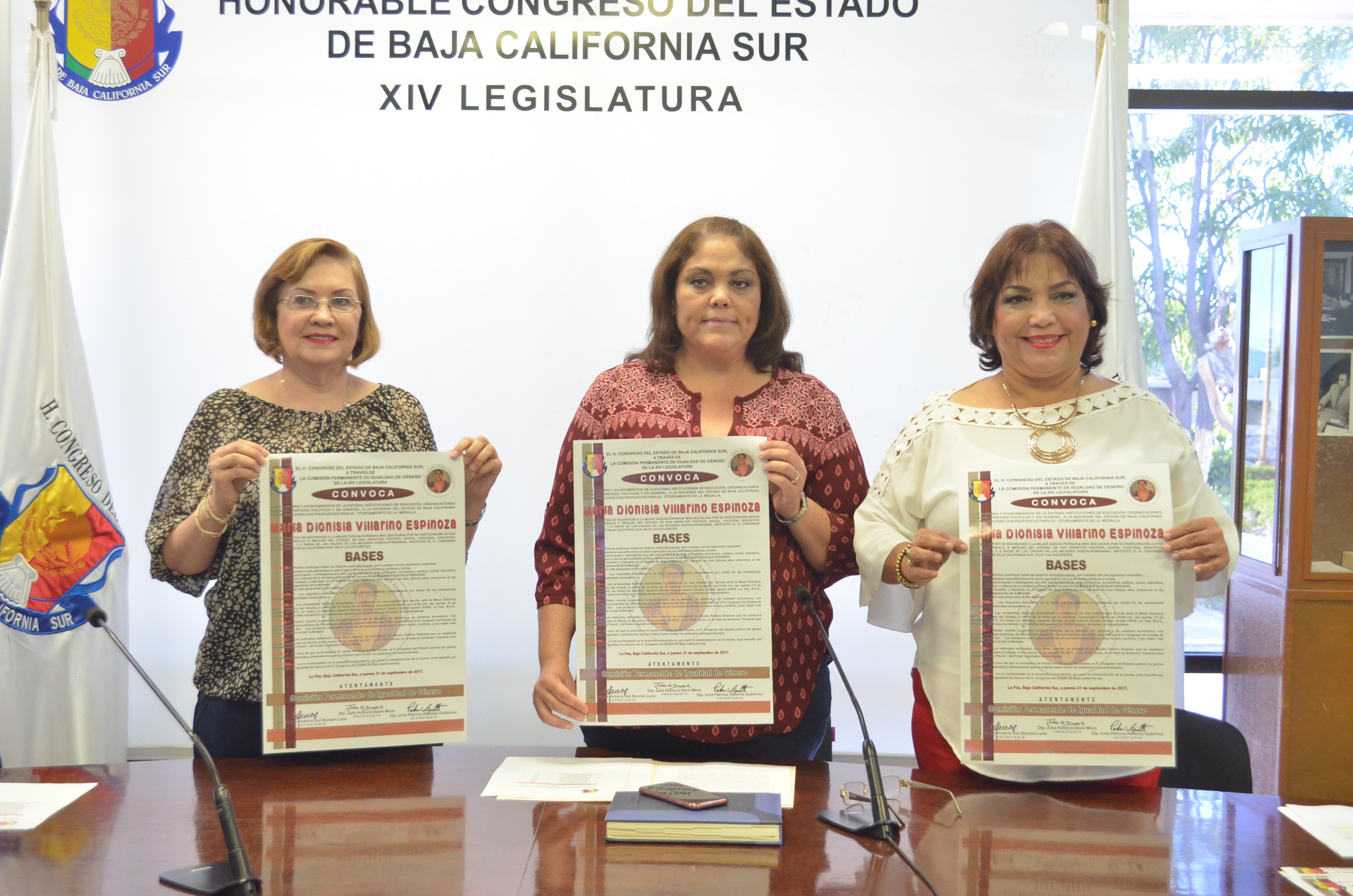 La Paz, Baja California Sur, a 21 DE Septiembre de 2017.- Con la finalidad de reconocer la trayectoria de la mujer de Baja California Sur en diversos campos de la vida productiva, social, económica, cultural y política, la Comisión de Igualdad de Género del Congreso del Estado dio a conocer la convocatoria para la entrega de la Medalla a la Mujer Sudcaliforniana del año 2017 “María Dionisia Villarino Espinoza”, misma que hace un llamado a instituciones públicas, sociales y privadas a presentar propuestas a la XIV Legislatura para ser evaluadas por la Comisión y votadas por el pleno de diputadas y diputados.