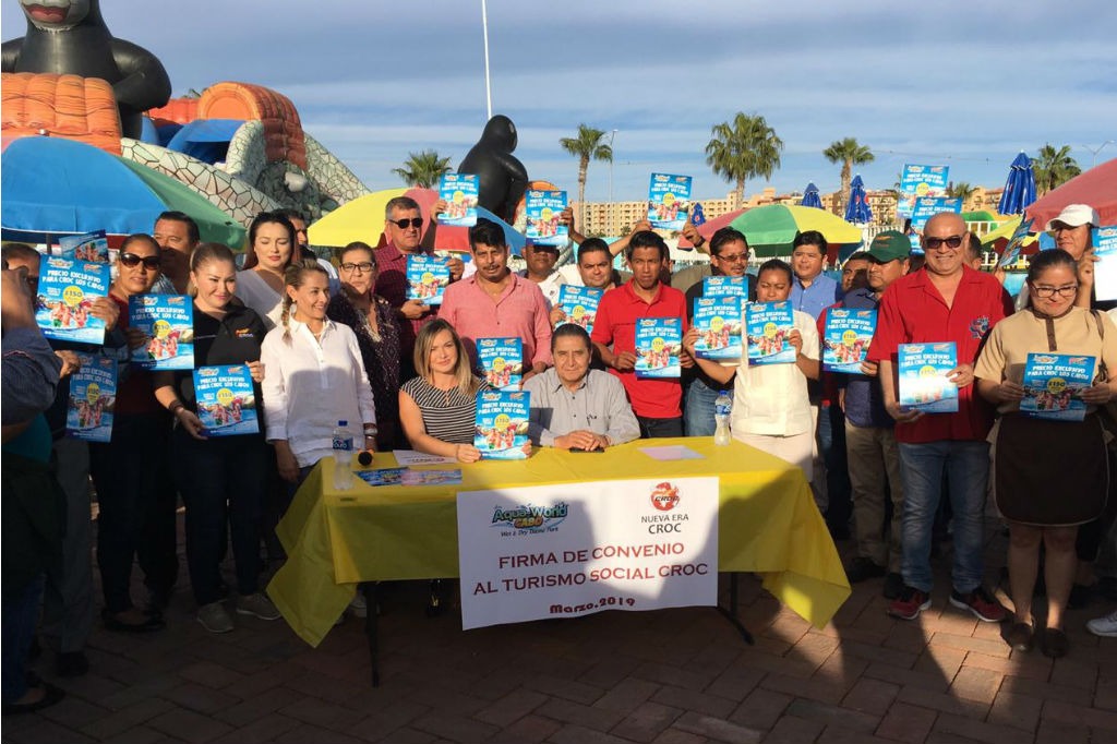 Cabo San Lucas, BCS.-En apoyo a la economía de sus agremiados la Confederación Revolucionaria de Obreros y Campesinos logró un convenio de “Turismo Social” con la empresa Aqua Word Cabo y con ello las esposas e hijos puedan disfrutar las más de 30 actividades con que cuenta el parque acuático ubicado en plena zona hotelera de San José del Cabo.
