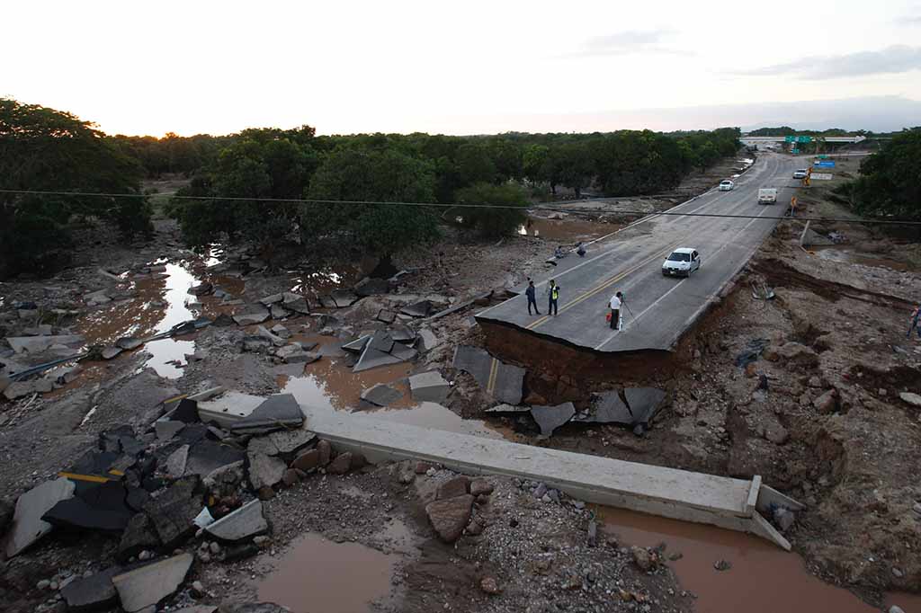 Durante un recorrido de Notimex por la autopista se observan los estragos del desbordamiento del Río Acaponeta, que dejó un gran boquete de más de tres metros de altura por cinco de ancho.