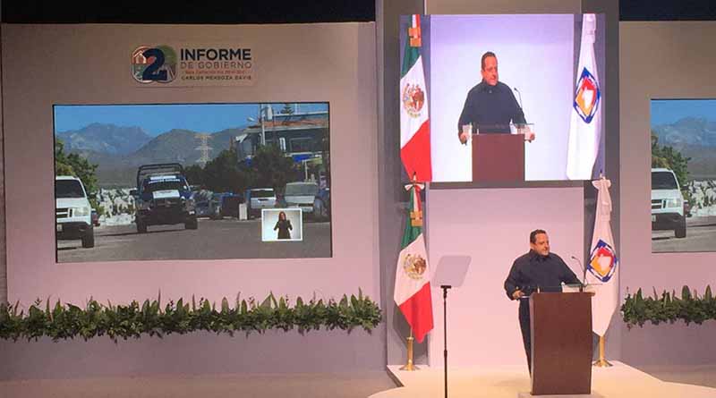 La Paz.- Al rendir su Segundo Informe de Gobierno, el gobernador Carlos Mendoza Davis inició hablando sobre el rubro de seguridad donde al referirse de la ola de violencia que aqueja a la zona sur del estado que “los violentos serán derrotados”.