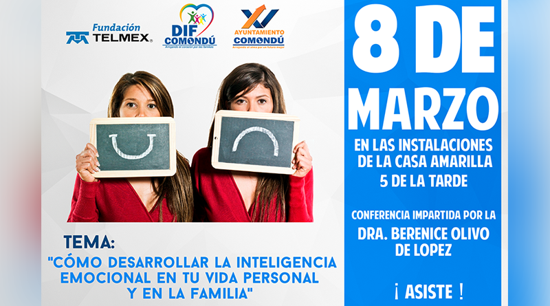 El Ayuntamiento de Comondú, en coordinación con DIF municipal, bajo la promoción de La Fundación Telmex, invita a la conferencia magistral “Como Desarrollar la Inteligencia emocional en tu vida personal y Familiar”, la cual se llevará a cabo, este miércoles 08 de Marzo a las 5 de la tarde, en el salón de la Casa Amarilla, dio a conocer la directora del DIF Municipal, Lic. Klaire Higuera Espinoza, indicando que esta actividad forma parte del programa para conmemorar el “Día Internacional de La Mujer”.