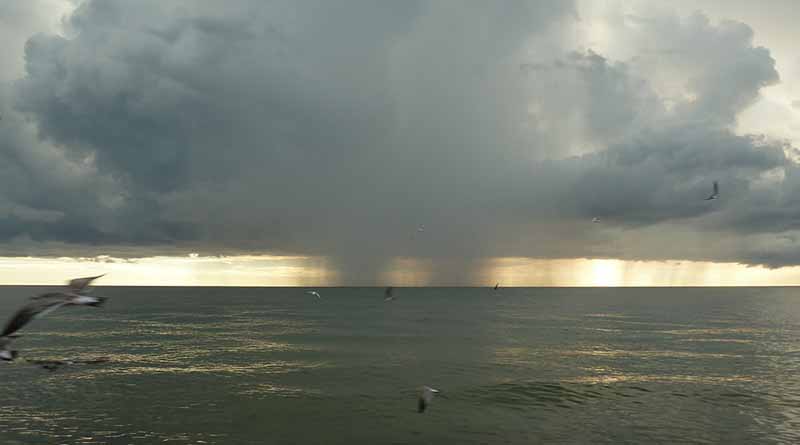 En el Golfo de México se mantendrá cielo nublado, 80 por ciento de probabilidad de intervalos de chubascos muy fuertes con tormentas puntuales intensas en Veracruz; intervalos de chubascos fuertes con tormentas puntuales muy fuertes en Tabasco e intervalos de chubascos con tormentas puntuales fuertes en Tamaulipas.