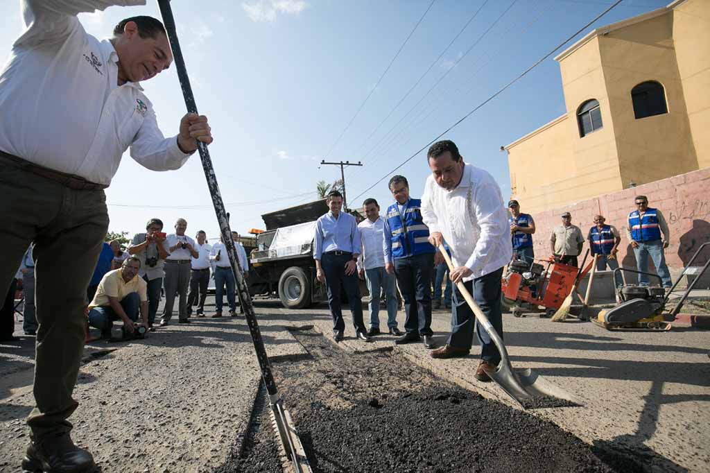 El gobernador Carlos Mendoza Davis dio el banderazo de inicio al Programa Estatal de Bacheo en la ciudad de La Paz, el cual tiene el objetivo dar mantenimiento inmediato y de calidad, en una primera etapa, a las vialidades de mayor circulación, el cual se trabajará por polígonos, para posteriormente atender accesos a colonias y sus principales calles.