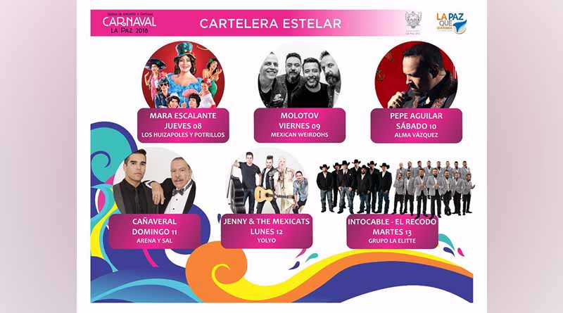 Martínez Vega mencionó, que el jueves 8 de febrero en el marco de la quema del Mal Humor y coronación del Rey de la Alegría, se presentará la comediante Mara Escalante, el viernes 9 el grupo de rock Molotov, continuando el sábado 10 con la coronación de la Reina del Carnaval y el concierto de Pepe Aguilar.El domingo 11 se presentará el grupo Cañaveral y el lunes 12 Jenny &TheMexicats, cerrando la fiesta el día martes 13 con el concierto del grupo Intocable y la Banda El Recodo.